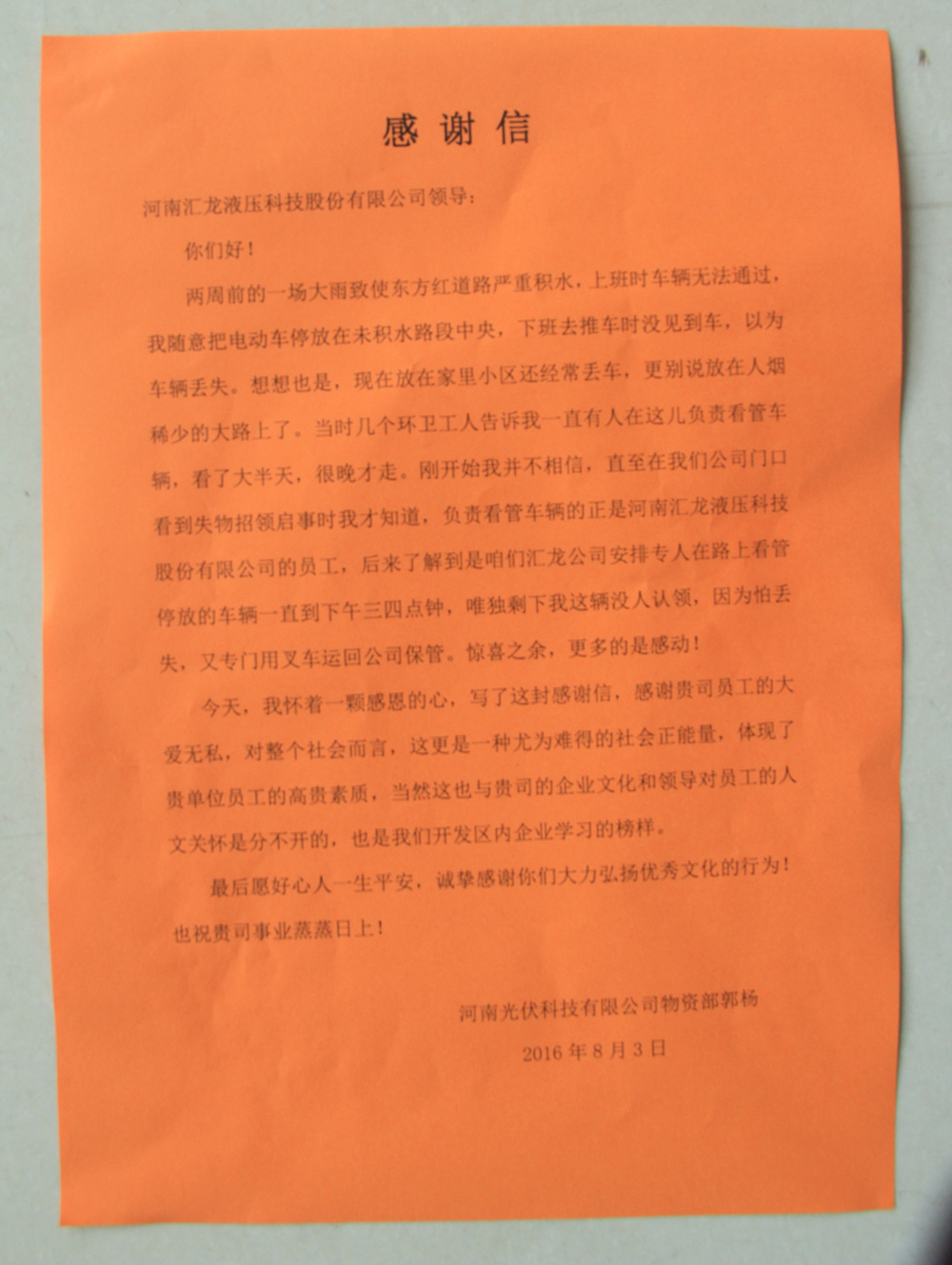 8月2日,協(xié)鑫的兩名員工來到我公司認領電動車,電動車主人為協(xié)鑫物資部郭楊,郭楊說,她幾乎已經(jīng)放棄了尋找電動車的希望,并把電動車防盜鎖的鑰匙都給扔了。8月3日上午,我公司設備部員工幫忙將電動車的鎖打開,郭楊高高興興地推走了電動車。下午,郭楊又同協(xié)鑫行政部、供應部、采購部的幾名人員前來我公司進行感謝,并帶來了一封感謝信。
