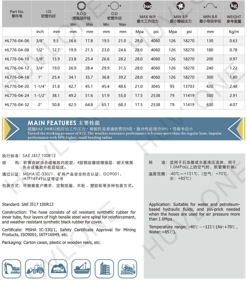Product Usage:Suitable for water and petroleum-based hydraulic fluids,and pin-prick needed when the hoses are used for air pressure more than 1.0Mpa.