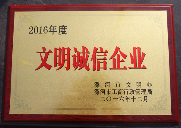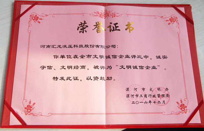 為培育和踐行社會主義核心價值觀,不斷提高公民道德素質(zhì)和社會文明程度,積極營造文明、誠信的社會環(huán)境,漯河市文明辦、漯河市工商局在全市開展“文明誠信企業(yè)、文明誠信商戶”的評選活動,通過有關(guān)部門層層嚴(yán)格把關(guān)、逐級推薦,河南匯龍液壓科技股份有限公司獲得了“2016年度文明誠信企業(yè)”的榮譽(yù)稱號。