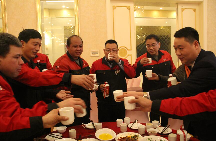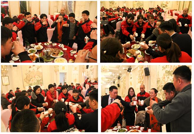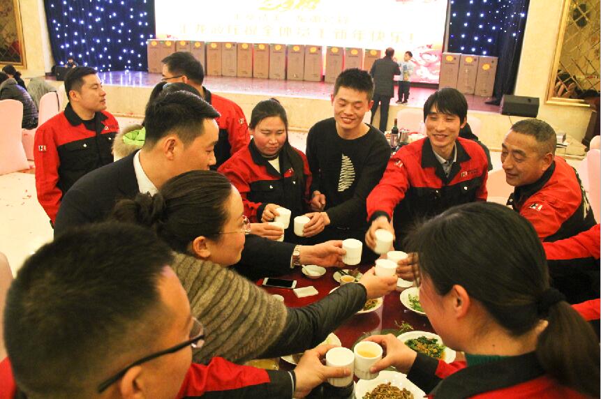 席間,董事長帶領著部門領導來到餐桌前對全體員工表達感謝和祝福。