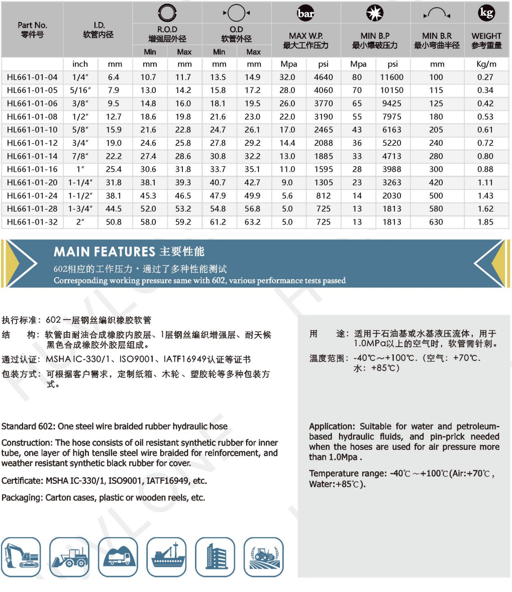 產(chǎn)品用途:適用于石油基或水基液壓流體,用于1.0MPa以上的空氣時,軟管需針刺。