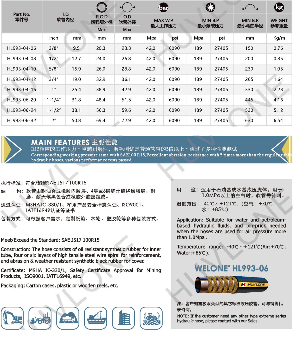 符合/超越SAEJ517 100R15四層鋼絲纏繞耐磨橡膠軟管