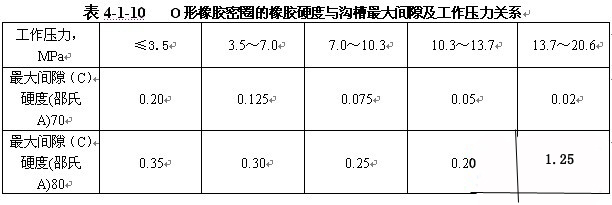 密封間隙的大小與壓力等級、橡膠硬度及O形橡膠密封圈斷面的直徑相關情況,見下表: